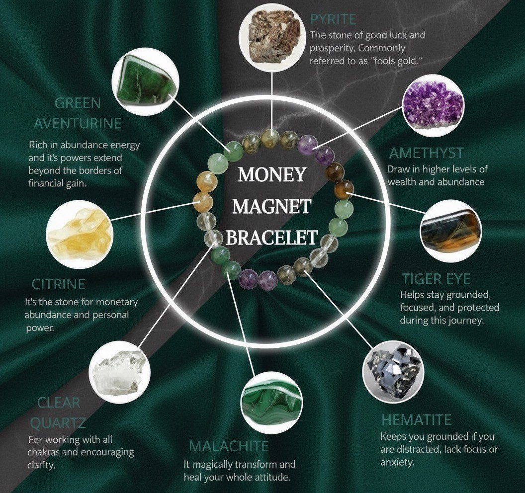 This bracelet combines carefully selected natural stones known for their luxurious appearance and symbolic association with wealth and success, creating a stylish and meaningful accessory.