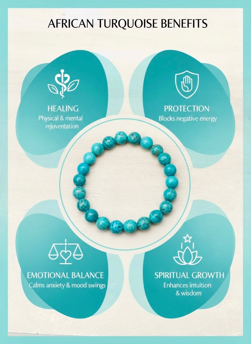 Inspired by centuries of tradition, African Turquoise is prized for its vibrant color palette and artisan craftsmanship, making every piece one-of-a-kind.